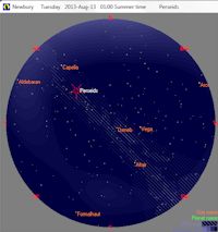 However, this assumes the radiant is overhead. Unfortunately the lower the radiant is the fewer meteors will pass through the visible area of sky. For the Perseids, at midnight in the UK, the radiant is only 45 degrees up so this reduces the likely rate to about 70 meteors per hour - even under the darkest skies.