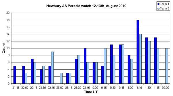 Five members of the society, David Boyd, Ann Davies, Bob Ferryman, Steve Harris and Kath Nurse (Team 1) counted and recorded meteors from 21:45 to 2:00 UT. Richard and Nicky Fleet (Team 2) observed alternately for an hour each from 22:00 to 2:15 UT. The bar chart of our results shows the meteor rate rising to a peak around 1.30 and then falling. There is good consistency between the counts of both teams. We are contributing these results to the Perseid observing campaign being coordinated by the BAA.