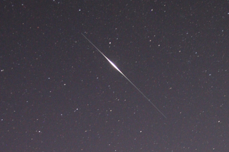 This image from the Perseids last year seemed almost to good to be true, and it was. The trail points back to the radiant but there is something not quite right about the look of it. On closer examination it turned out to be a satellite flare truncated by the end of the exposure.